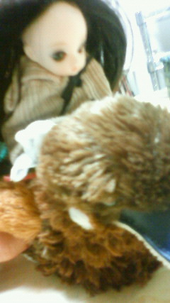 乗っているのはパパン(義父)から貰った鴨のぬいぐるみ。